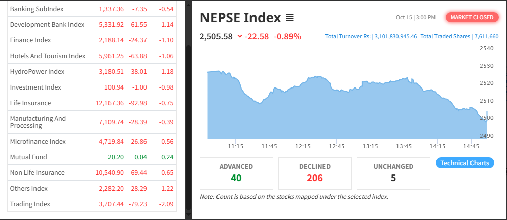 आज नेप्सेमा कारोबार भएको ३१४ कम्पनीको २ करोड ३० लाख ११ हजार ३६१ कित्ता शेयर किनबेच हुँदा १० अर्ब ५४ करोड १७ लाख ४६ हजार रुपैयाँको कारोबार भएको छ । आज बजारमा वृद्धि हुँदा नौ उपसूचक हरियाली भएको छ ।